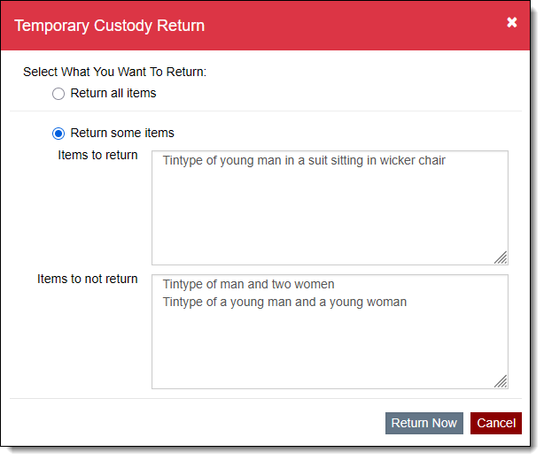 Your institution may decide to return or dispose of the temporary custody items without accessioning or keeping them as a loan. In this case, a Temporary Custody Returned record may be created so you can keep track of the items you did not keep. Some or all of the items on a Temporary Custody record may be returned.