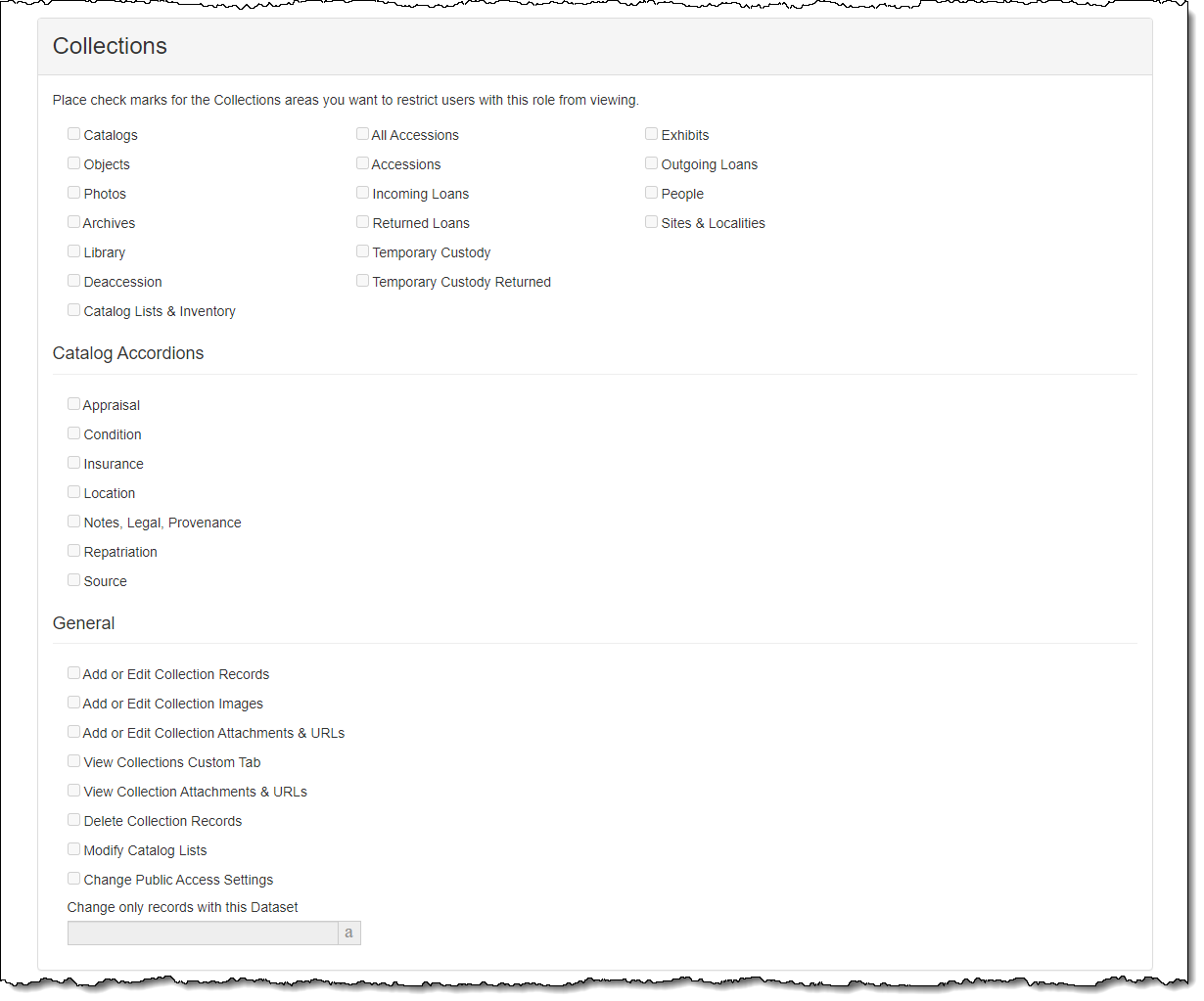 Security in PastPerfect Web Edition is controlled by user accounts and roles. Each user is assigned to a particular role, and restrictions are based on the roles. For instance, you may have a role for "Curator" who has full access to the Catalogs and Accessions, but is restricted from Contact and Development functions.