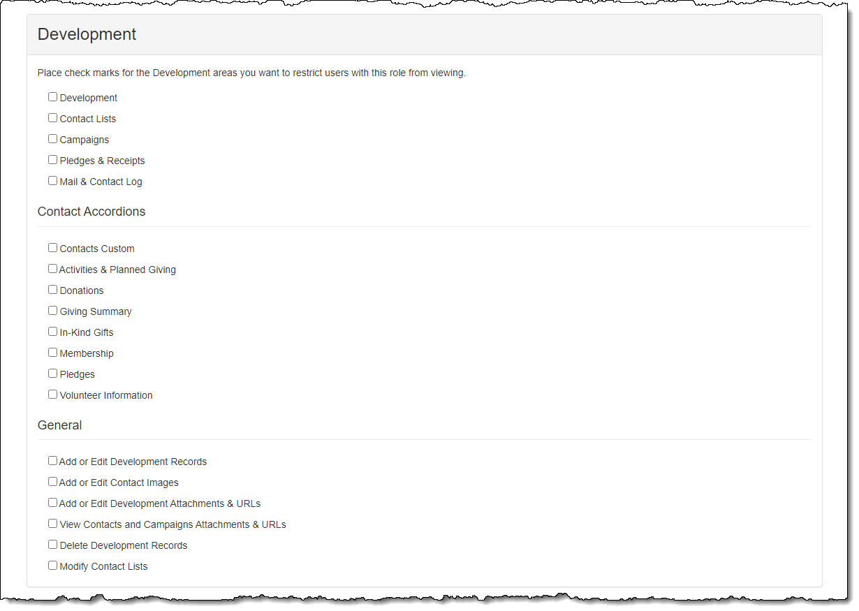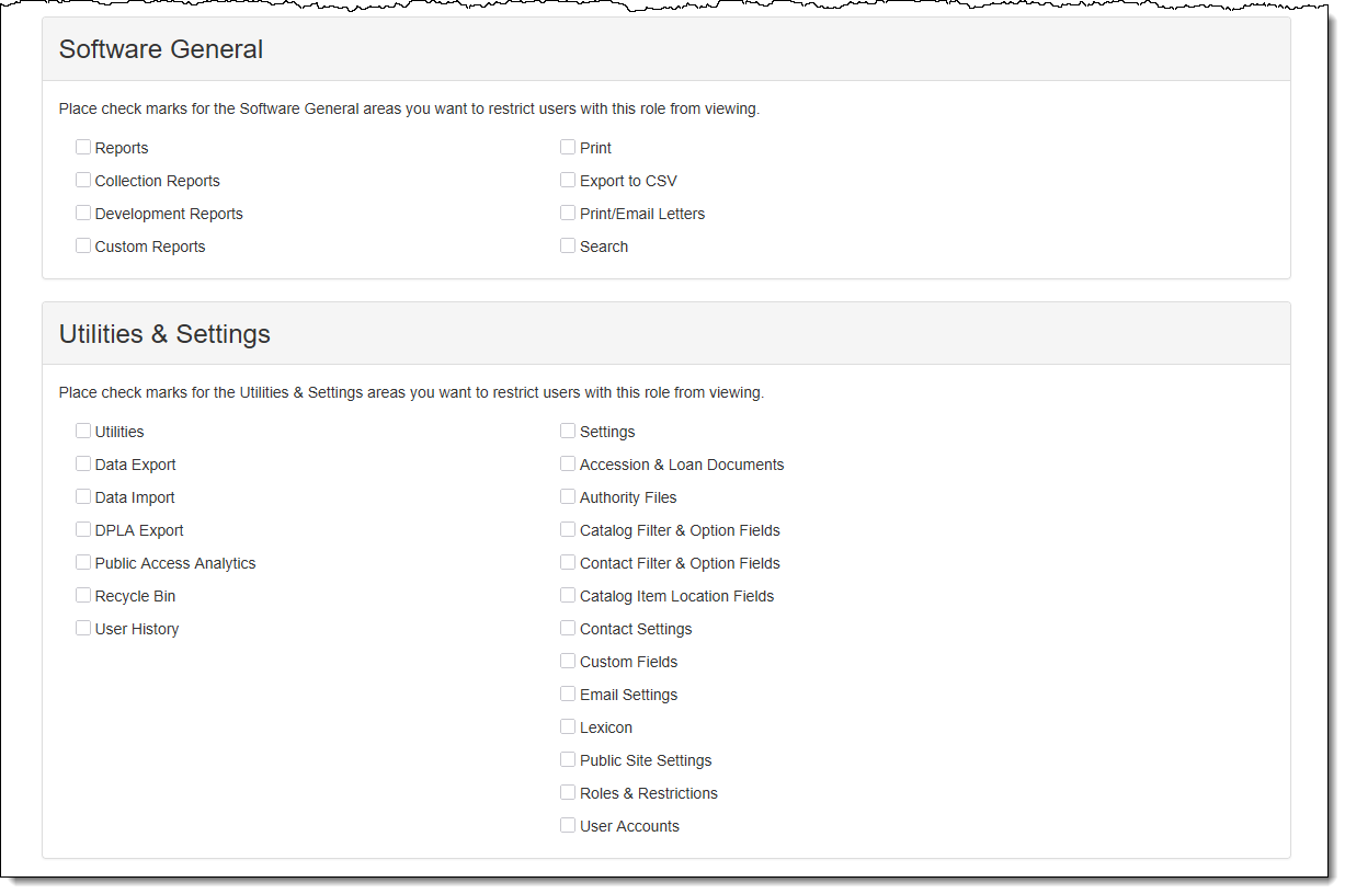 3.Place a check next to the areas/functions to which users in this role should NOT have access. Click here for a list of brief descriptions for each restriction.