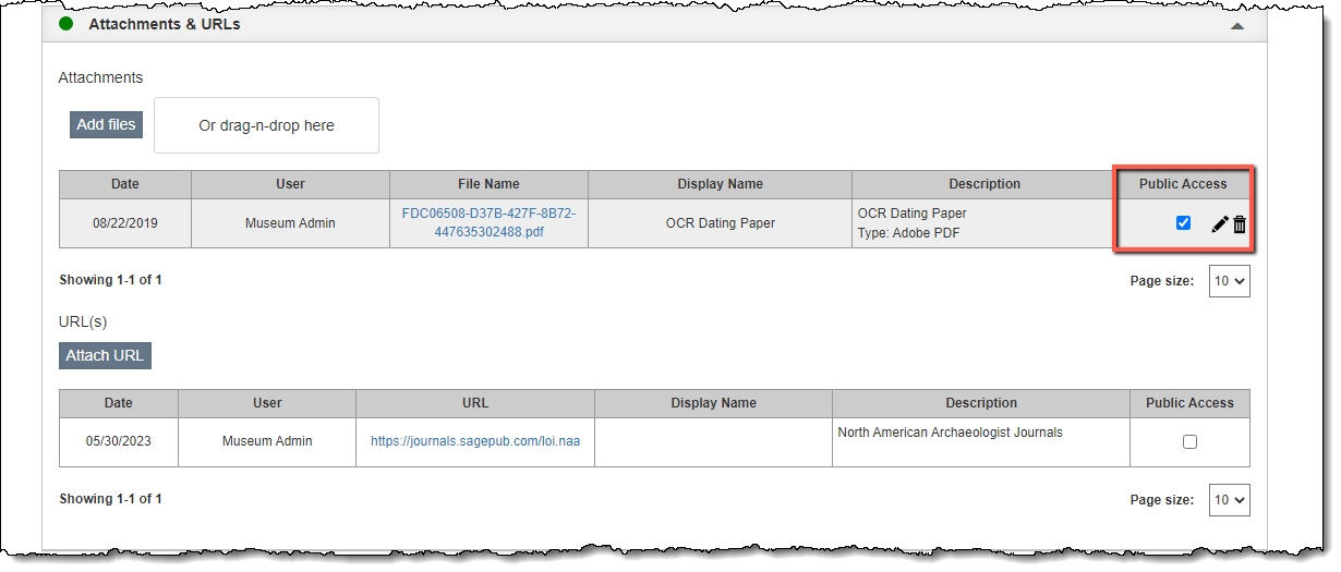 The Attachments and URLs added to your records can be shared on your public site. When shared, an Attachments and/or URLs field will display on the record with a hyperlink to view the file or the URL.