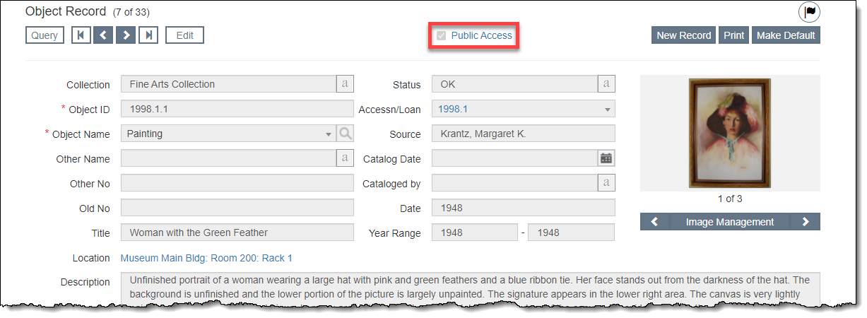 When you select a record to be included in Public Access, all images associated with that record are also selected with the exception of images marked Restricted. It is possible to deselect individual images on the Image Management screen so they do not appear on your public site.