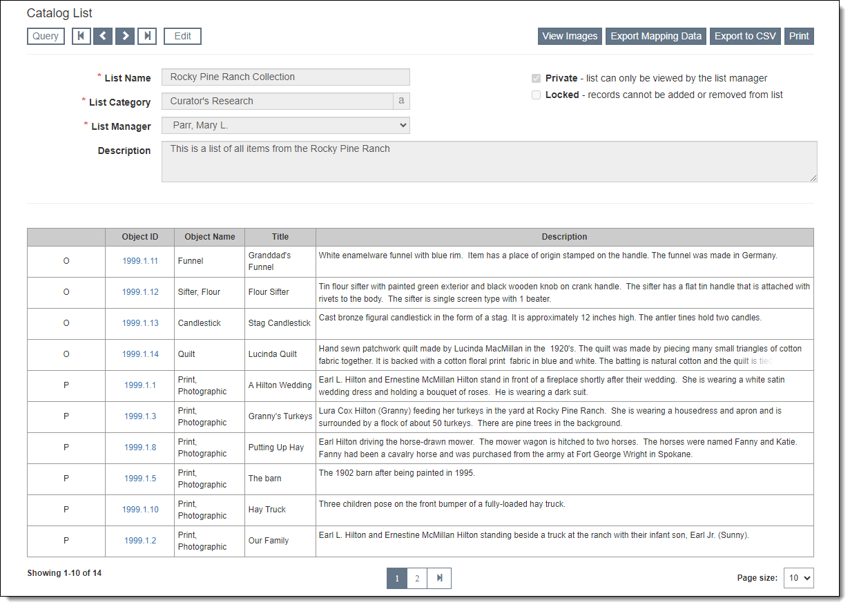 When you click the name of a specific list on the Catalog List Query screen, you will arrive at the Catalog List screen. From here you can view and edit basic list information, view images, export mapping data, export to CSV, print reports, and browse the records on the list.