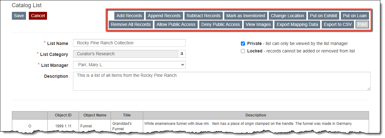 At the top of the Catalog List screen, you can populate and edit basic list information: List Name, List Category, and Description. If you are the List Manager, you can also change the List Manager and mark whether a list is Private or Locked.