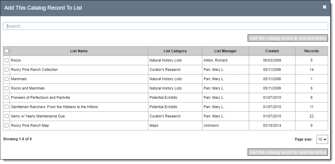 - On the pop-up window, search or browse for the catalog list(s) to which you wish to add this record
