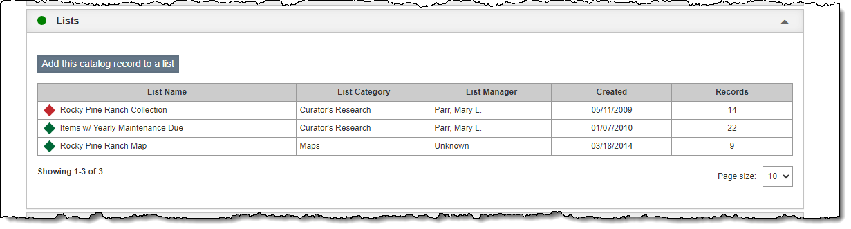 The Lists Accordion contains all the Catalog Lists in which this record is included. You can add this record to a list or click on the List Name to view the selected list and the other records that appear on the list. For more information on working with lists, see Catalog Lists.