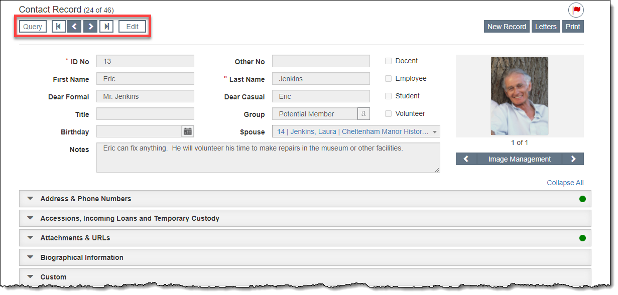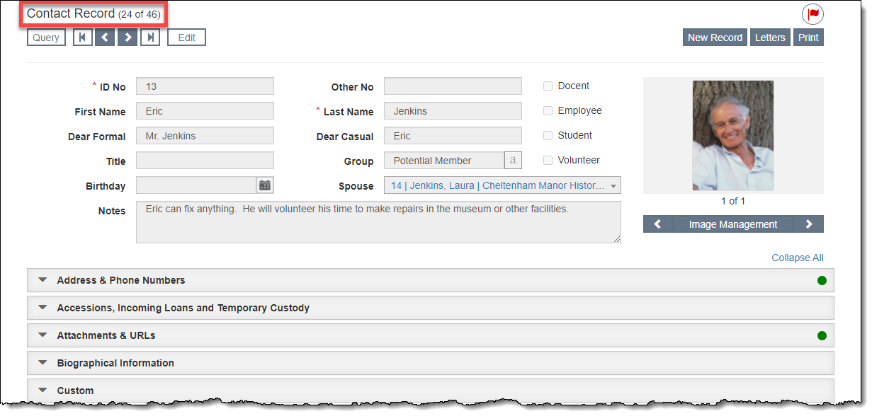 The record type will display as Contact Record in the top left of the record screen, regardless of whether someone is a donor, member, volunteer, etc. Next to the record type is the record count of the subset you are viewing (e.g. 10 of 83).