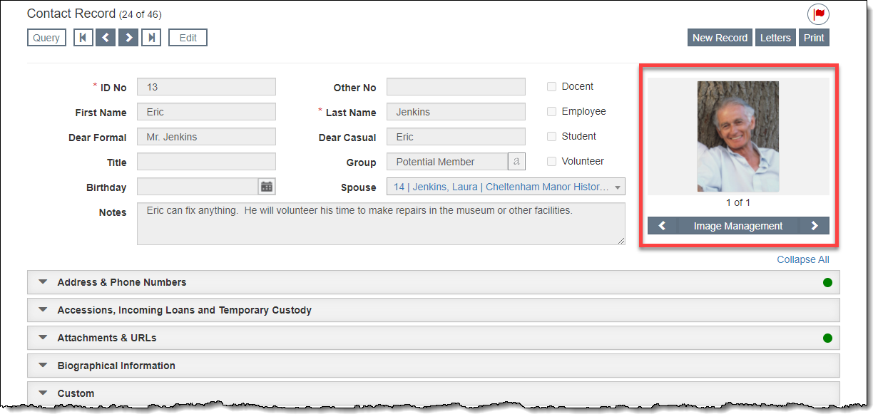 The Image Management section is available on the right side below the Action buttons. If an image is attached to the record, the thumbnail will display on the record screen. The Image Management button allows you to attach new images or view existing images attached to the record.