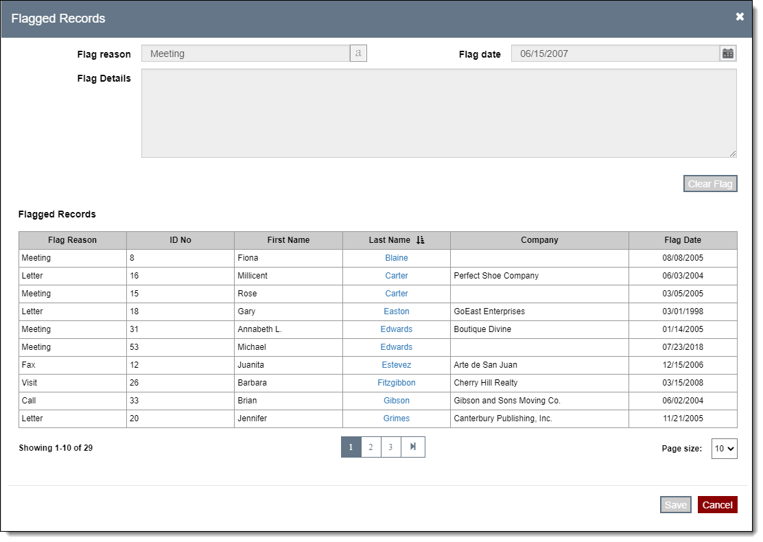 To view a flagged record, click the Flag icon to open the Flagged Records pop-up window. From here you can read the details about why the item is flagged as well as view a list of all of the flagged records. Click the Object ID, Accession No, or Last Name hyperlink to navigate to those records.