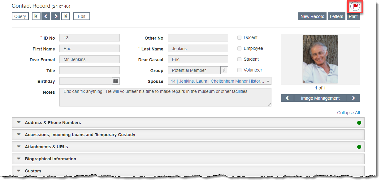 Catalog, Accession, and Contact records have the ability to be flagged for further attention later. The flag is located in the upper right corner of the record, above the Action buttons. When a record has been flagged, the Flag icon will appear in red.